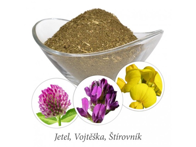 Sušené byliny, jetele a trávy: vojtěška, jetel luční, jetel plazivý, tolice dětelová, štírovník růžkatý, vičenec, kmín, bedrník, řebříček, mrkev obecná pravá, jitrocel kopinatý, bojínek, lipnice luční a mladá nať topinamburu.