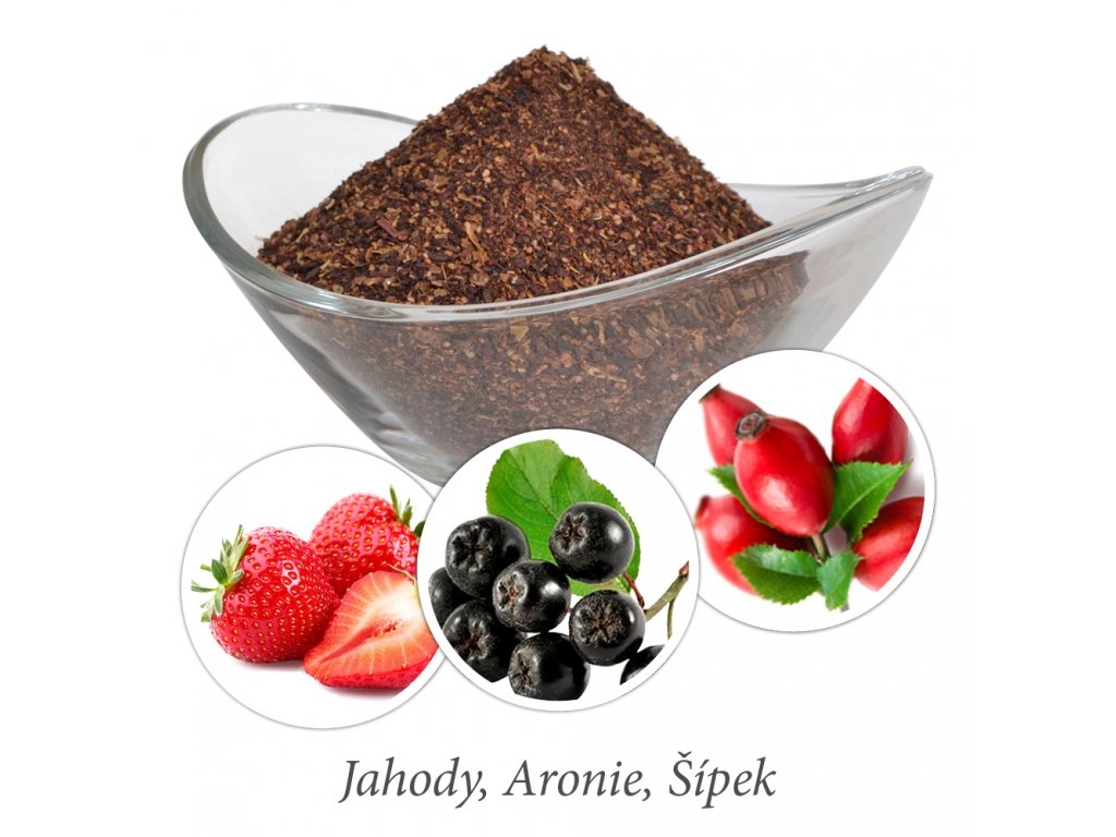 Arónie, jablko, jahoda, černý rybíz, šípky - slupky, obilné klíčky (sladový květ), pivovarské kvasnice.