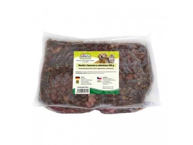Hrubě mletý komplet syrového hovězího masa, vnitřností a chrupavek z hrdla, s lososem a zeleninou v potravinářské kvalitě z volných chovů od regionálních farmářů z Německa.