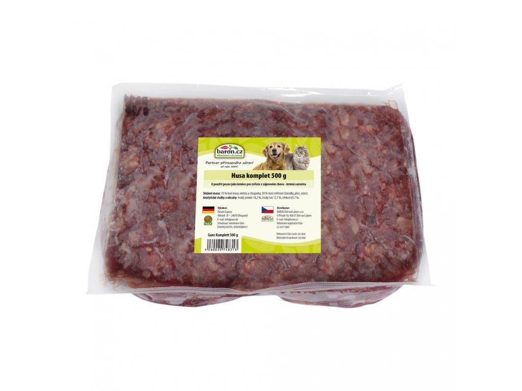 Hrubě mletý komplet syrového husího masa, skeletů, chrupavek a vnitřností v potravinářské kvalitě od farmářů z Francie, alternativně z Německa.